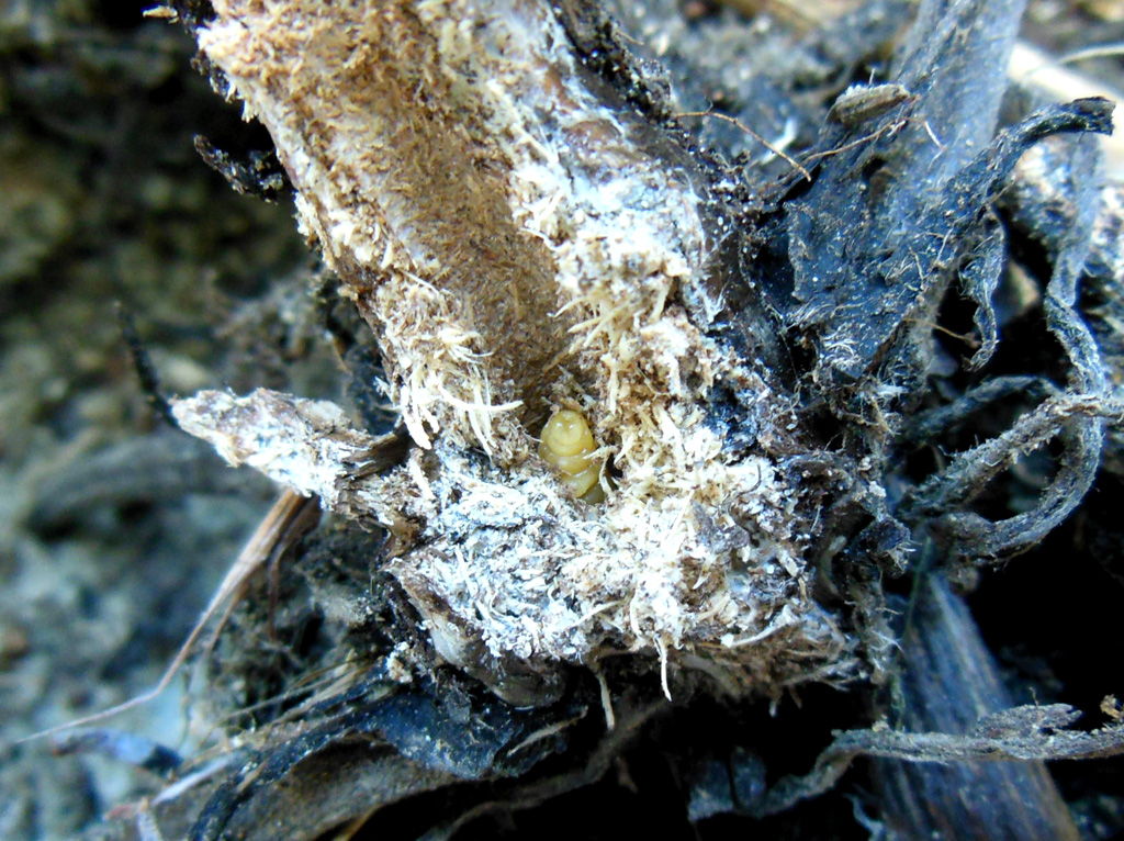 Larva nella radice della pianta, a destra la parte del fusto che è fuori dal terreno, a sinistra la radice sotterranea dove prosegue la galleria larvale (12,X,2019)