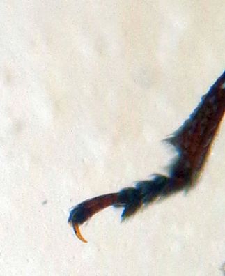 Foto richiesta (80x ma un po' rimpicciolita per renderla simile a quella sopra) delle unghie secondo paio lato destro (perchè quelle a sinistra del topic sopra sono troppo appiattite al cartellino e la visione diretta è complicata. Non si vedono apprezzabili denticoli ma c'è un problema; visto che altre chiavi non citano i particolari delle unghie, ho messo l'esemplare al microscopio ottico (50x, non posso fare foto) e alle unghie anteriori e posteriori si apprezza un piccolissimo denticolo prebasale molto acuto, praticamente invisibile o quasi alle unghie medie. Mi chiedo quanto sia affidabile il carattere: certo nei miei tessellatus il dente è molto più evidente e meno acuto nei tre tarsi e la forma generale e colore dei tegumenti è diversa; inoltre, gli omeri mi pare di vedere siano più o meno arrotondati secondo il sesso (più tondi nei maschi). In sintesi, a mio modesto parere, credo che colore e, almeno nelle femmine, la forma di torace ed elitre siano più affidabili per le due specie. ![]() |