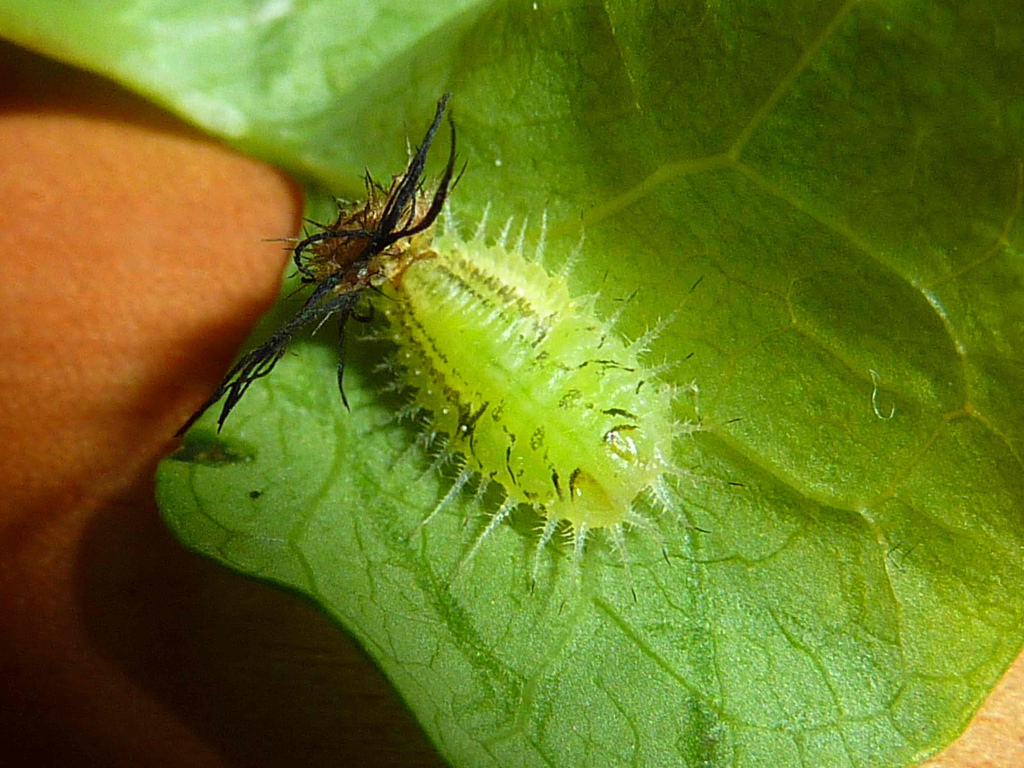 Il 27 agosto ho notato il primo accoppiamento e trovato alcune ooteche (immagine 4), di forma inusuale rispetto a quelle delle specie italiane che conosco, e il 4 settembre ho trovato le prime larve (circa 20), lunghe circa 0.5 mm, di colore verde molto chiaro che in pochi giorni sono cresciute di vari mm e che invece dell'usuale scutello mostravano alle terga una sorta di "festoni" di escrementi (immagini 5 e 6). Successivamente ai "festoni" si sono aggiunte le spoglie delle mute precedenti (immagini 7 e 8). Tra il 20 e il 21 settembre le larve si sono tutte impupate e sono sfarfallate tra il 27 e il 28. Il 3 ottobre ho osservato il primo accoppiamento della "seconda generazione".