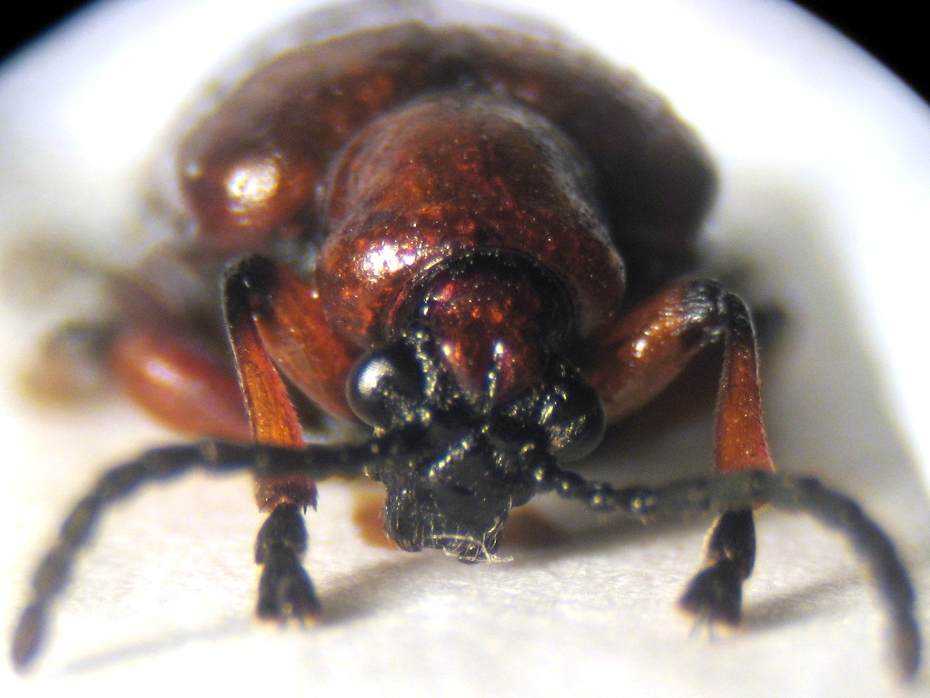 Questa non mi sembra molto una Lilioceris merdigera ma non è sicuramente L. lilii Può essere la L. schneideri? E' il capo nero con vertice rosso che mi disorienta poi magari è sempre L. merdigera Prima del bagno in acetone me la ricordavo un po' più rossa (ma forse è ancora bagnata sotto le elitre), ma il bagno ci voleva perché era ingrassata da morire, ora pure non è proprio linda ma molto meglio di prima. L. = 8 mm |