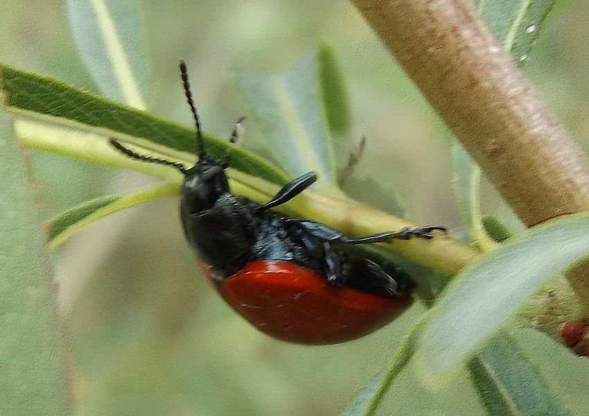 Chrysomela populi o Chrysomela saliceti. Difficile dirlo da queste foto. Anche se stava sul salice, che farebbe pensare alla seconda, C. populi preferisce i pioppi ma si può trovare pure sui salici, e di solito è molto più comune dell'altra. PS - Dovresti rivedere varie cose scritte sul tuo sito. Ad esempio, quello che chiami Scolytidae in reltà è un Tenebrionidae: Helops. Che agli Scolytidae (ora Curculionidae Scolytinae) neanche somiglia. Il Dolocerus reichii (Brachypteroma ottomanum) non è uno scarabeo, ma un Cerambicide. |