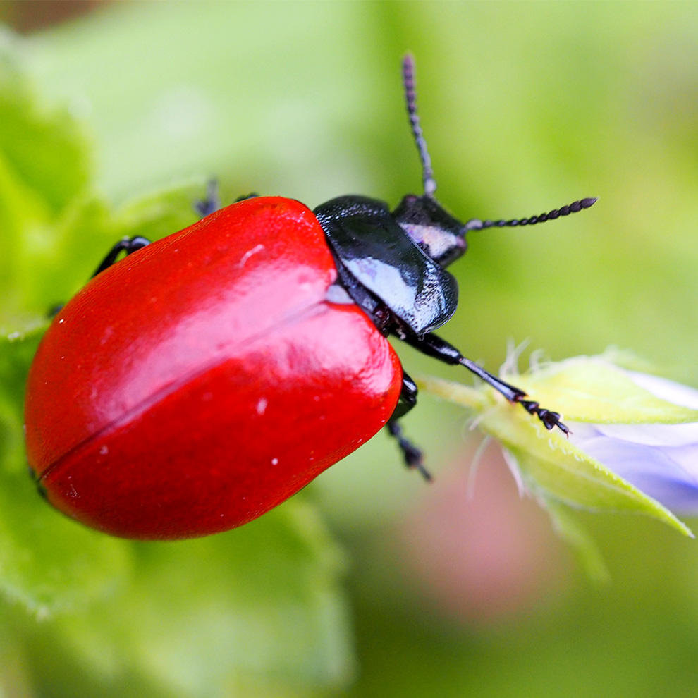 Chrysolina populi che era immobile alla base di una pagina superiore di una foglia erbacea, in un prato di uliveto. Colore: rosso delle elitre meno vivace e più metallico rispetto alla C. lutea.