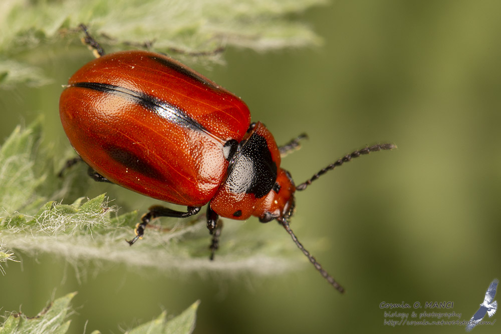 Entomoscelis adonidis (dark clypeus and pronotal black spot extending to the anterior margin of pronotum).