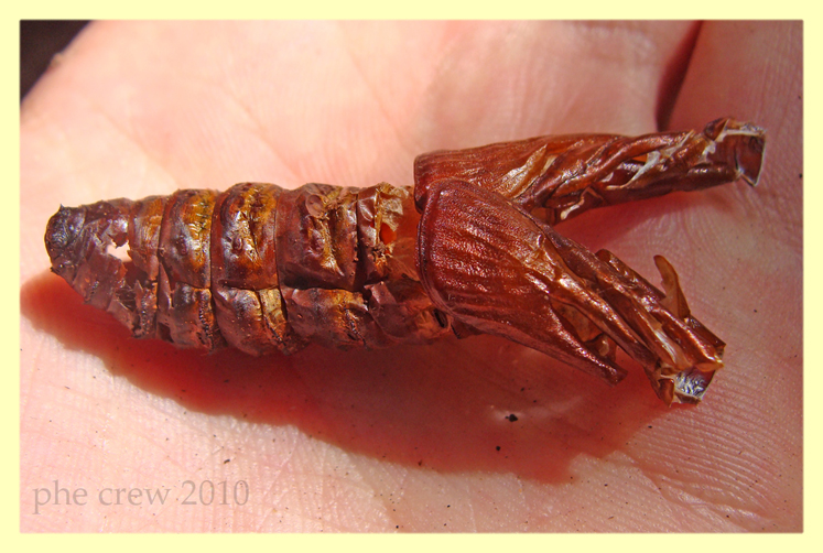 Io ho trovato diverse volte crisalidi dentro agli alberi e molte volte exuvie come quella illustrata, che sporgono a metà dal tronco.