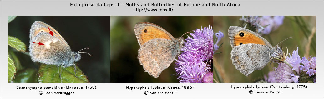 Da notare la parte evidenziata dalle frecce sulla C. pamphilus che a circa metà dell'ala (nel punto di separazione tra l'area discale da quella postdiscale) ha quel disegno bianco/panna sfumato sempre abbastanza evidente ed un colore generale dell'ala molto omogeneo, anche se sfuma schiarendosi verso l'esterno. Le Hyponephele hanno invece sempre un colore di fondo più marezzato e la linea di separazione (area discale/postdiscale) quando visibile è molto sottile non presenta nessun ingrossamento sfumato.