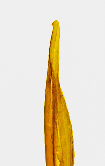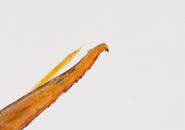 Leonardo, ho realizzato ora un'altra immagine più chiara dell'apice del pene di Colymbetes schildknechti Dettner, 1983, in cui si vede meglio ciò che volevo farti notare. Infatti, in questa specie, non solo l'apice del pene si presenta "a becco d'uccello", ma il bordo inferiore del pene, nella parte distale, è distintamente dentellato.
