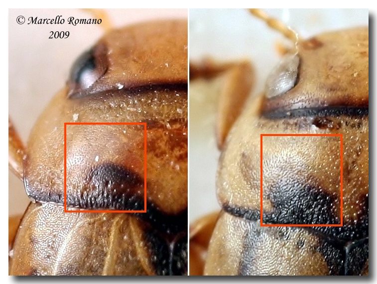 Come avevo promesso a Loris, inserisco stasera una foto del Nebrioporus elegans (Panzer, 1794), per confrontarlo con l'affine N. sansii (Aubé, 1836), da lui mostrato qui. Se lo confrontiamo con N. sansii (esemplare in basso a destra, già presentato qui), possiamo subito notare come il disegno elitrale di N. elegans è prevalentemente composto da un'area nerastra solcata da 4-5 linee longitudinali giallastre che, in generale, si allargano in zone più ampie, spesso confluenti. In N. sansii (a destra) il disegno elitrale è composto da una grossa zona nerastra, con alcune macchie giallastre, senza però la prevalenza di linee giallastre longitudinali. A più forti ingrandimenti, si nota un'altra importante differenza nella punteggiatura del pronoto. Se osserviamo l'area compresa entro i due rettangoli delimitati da una linea arancione, nella coppia di foto qui in basso, notiamo che in N. sansii (a sinistra) i punti basali del pronoto sono chiaramente impressi, subcircolari e non di aspetto ruguloso. In N. elegans (a destra) i punti basali sono meno profondi, subovali e, soprattutto, il fondo è assai più densamente ruguloso. Anche gli angoli posteriori del pronoto sono più smussati-troncati al vertice in N. sansii che in N. elegans, dove si presentano più o meno arrotondati e non troncati al vertice. (fonte: M. E. Franciscolo, Fauna d'Italia 1979) |