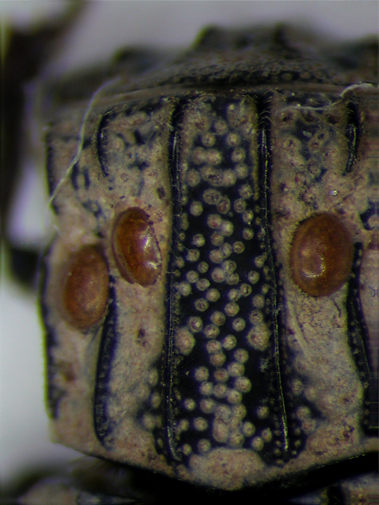La cosa strana è che sembra quasi che la struttura del protorace e delle eltre sia fatta apposta per ospitare questi acari, (vedere in particolare le depressioni sul protorace) tanto che mi è venuto il dubbio che si tratti di una forma di simbiosi. Può essere che gli acari, cosi disposti e colorati, rendano un sesso più attraente per l'altro? Ho visto altri esemplari, che non possiedo, sempre con acari e con la stessa disposizione.