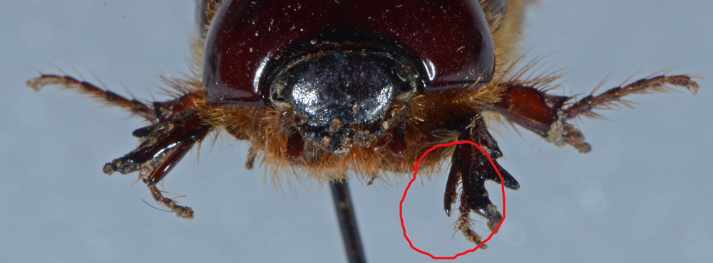 Il pronoto ha scultura molto diversa da nasicornis, i tarsi sono completamente differenti, poi la tibia ha una lunga spina (nel cerchio rosso) assente in nasicornis.