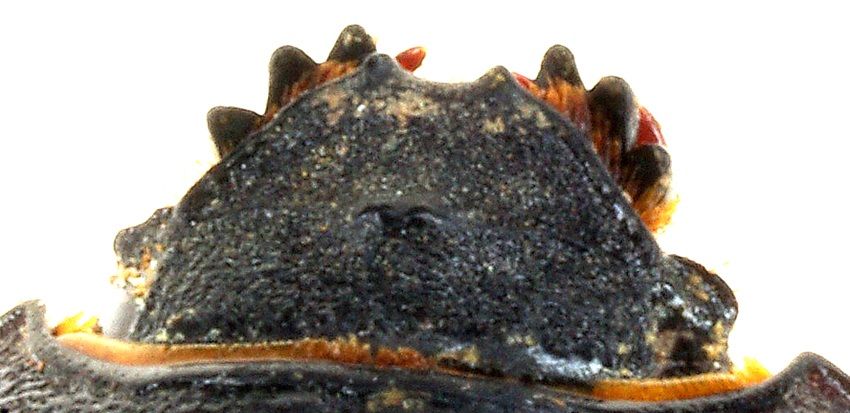 Ecco il dettaglio del capo. Effettivamente i tubercoleti sembrano due ma fusi, o meglio un unico tubercoleto con due dentini, diverso dai bidens sardi con i tubercoli distintamente separati.