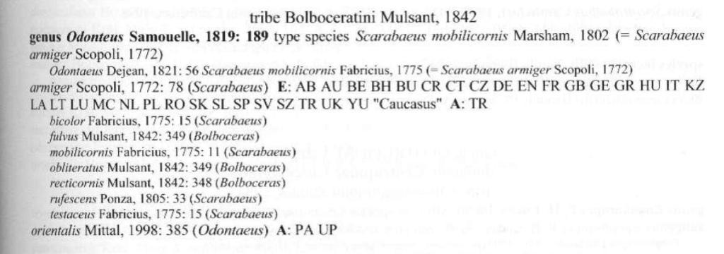 Keywords. Nomenclature; taxonomy; Coleoptera; GEOTRUPIDAE; Bolboceras; Odonteus; Scarabaeus quadridens; scarab beetle.