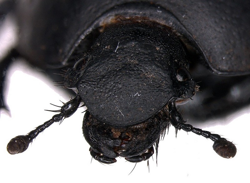 Questa mattina sono potuto tornare alla spiaggia in questione, e benchè molto di fretta, ho recuperato 3 esemplari. Come giustamente diceva Tenebrio, a guardare bene si vedono già in loco le differenze, ed effettivamente, sono 2 specie diverse. Uno dei tre ha le elitre marcatamente rigate e non ha riflessi bluastri su zampe e lato inferiore. Gli altri due il contrario. Li ho velocemente preparati (male, ma aggiusterò la posizione delle zampe più tardi, prima che secchino) e fotografati: dovrebbero essere quello centrale T. sardous e i 2 laterali T. intermedius. Oltre alla scultura elitrale e ai riflessi bluastri mi sembra di notare altre differenze, ad esempio il sardous ha un lieve solco longitudinale al centro del pronoto che manca nei due intermedius, non so se è un carattere costante. Entrambe le specie hanno invece il tubercolo mediano del clipeo. Credo di incontrare spesso, anche se forse non l'ho mai fotografato (devo controllare tutte le immagini di Geotrupidae che ho), anche un Thorectes in alta Gallura. Se è vero che le altre due specie sono solo costiere, quest'ultimo deve essere il geminatus. Questo è il dettaglio del "pesunto" T. sardous Questo è invece uno dei due "presunti" intermedius.