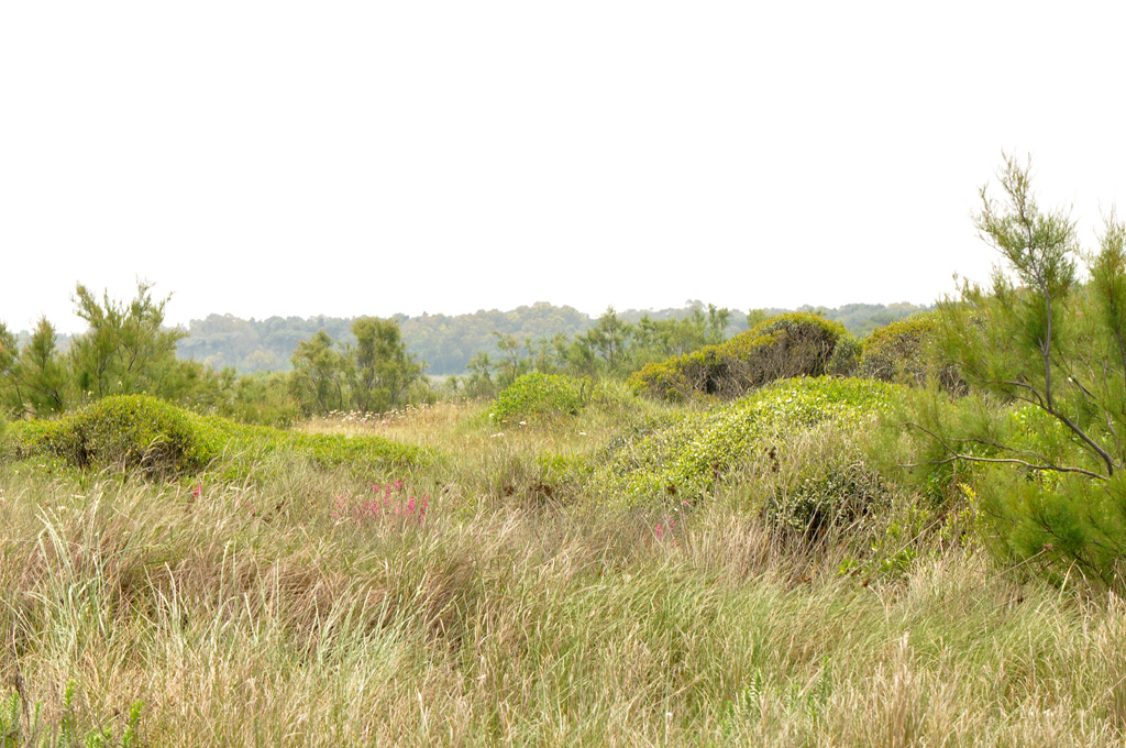 Stamattina sono tornato sul posto per fare un paio di foto del biotopo e vedere cosa c'era. La prima cosa che ho notato è che di Hoplia se ne vedevano pochissime, sia sugli steli d'erba che sui fiori di Tamarix; sui fiori di Juncus addirittura nessuna! Che si siano spostate? Comunque, allego un paio di scatti: mi scuso per la non perfetta qualità ma .... mi sono dimenticato di settare la macchina (era tardi e avevo fretta), e così è rimasta settata in manuale con i parametri per lo stacking  A complicare le cose una velatura alta del cielo. Un pò le ho recuperate con Photoshop, così almeno qualche cosa si vede. L'area paludosa è a circa 200 metri dal punto di osservazione, mentre la duna è circa 20 metri dietro l'obiettivo.