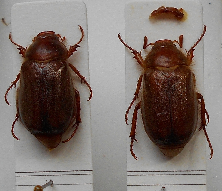 Ciao Gildoro, la foto dell'esemplare in natura che riporti è un'altra cosa, si tratta di un Rhizotrogus. Quando all'identificazione dei tuoi reperti, normalmente - come del resto ha detto Guido - vengono attribuiti ad A. assimile, ma c'è un problema aperto che riguarda la coppia di specie A. assimile e A. burmeisteri. Sono specie gemelle, quasi indistinguibili, sulle quali non sembra essersi raggiunto un consenso. Tradizionalmente, ad A. burmeisteri viene attribuita una testa più larga e una punteggiatura pronotale più densa rispetto ad A. assimile, ma per le dimensioni della testa non vengono esplicitati dati quantitativi e la densità della punteggiatura del pronoto è di difficile interpretazione. Visti gli esemplari attribuiti da altri a queste due specie si tratta di differenze minime e soggette a variabilità interpopolazionale. Poi, in anni recenti è stato pubblicato un lavoro su questa coppia di specie, che - purtroppo per me - è in tedesco e ciò mi preclude di comprendere bene la discussione. La conclusione a cui arrivano gli autori, però, è che le due specie hanno diverse abitudini comportamentali: burmeisteri volerebbe alto di sera, assimile volerebbe rasoterra e di giorno. Ora, sapendo che le popolazioni del nord Italia (almeno quelle della Pianura Padana) volano rasoterra di sera, capisci bene che uno resta interdetto... |