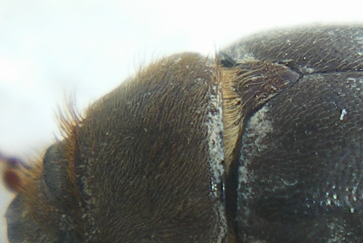 Dovresti controllare la pubescenza alla base del pronoto in prossimità dello scutello. Lì dovresti notare lunghi peli eretti nel caso di Haplidia etrusca. In quest'ultimo caso allo stereomicroscopio dovresti notare anche che lo scutello è quasi completamente liscio.