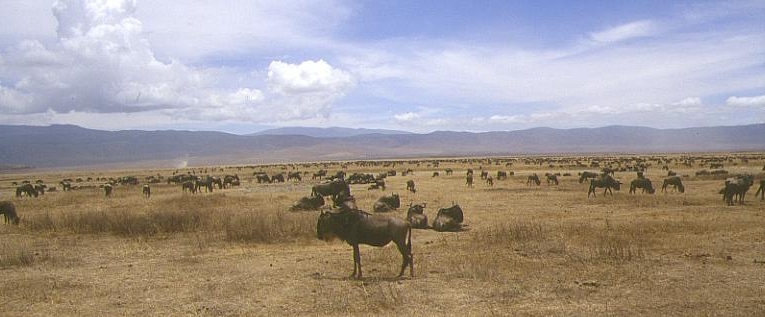 Trovato (morto ed un po' acciaccato) nell'ottobre 1996 nel parco nazionale del Serengeti, Tanzania. Misura la bellezza di 52 mm zampe escluse. Penso che un bestione così grosso abbia una sua notorietà, e quindi sarà facile da determinare per chi ha un po' di letteratura sugli Scarabaeidae tropicali. Credo sia del genere Heliocopris, ma non sono riuscito ad arrivare alla specie. Aggiungo una foto dell'ambiente in cui viveva, tanto per far capire che il substrato alimentare non gli mancava. Non è detto però che fossero gli gnu la fonte di cibo, non mancavano bufali, elefanti, zebre, grosse antilopi, giraffe ecc. |