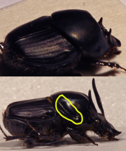Grazie a tutti Ero un po' perplesso dal confronto con il taurus che posto qui di seguito Mi ha confuso il diverso profilo del margine posteriore (o anteriore ?) del pronoto che in taurus sembrerebbe ondulato , e in particolare le fossette laterali ben marcate sempre del pronoto ma a ben vedere si adattano perfettamente con il profilo dei corni . Evidentemente il pronoto , negli esemplari normali cioe' ad antenne lunghe, si deforma per permettere la posizione di riposo dei corni stessi Luigi