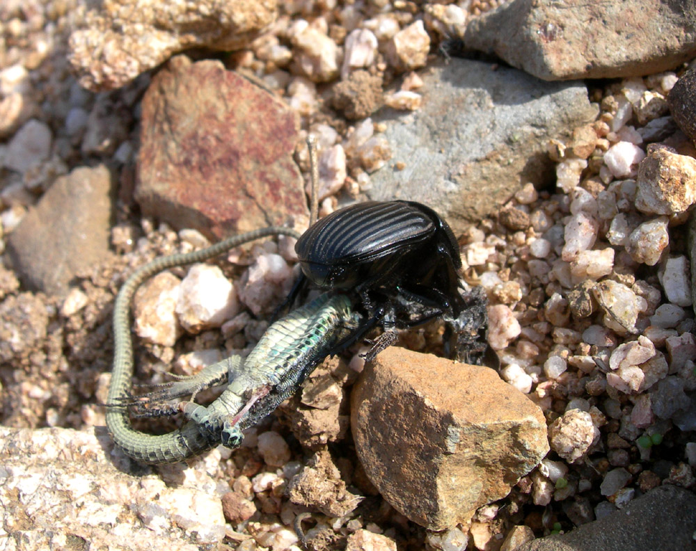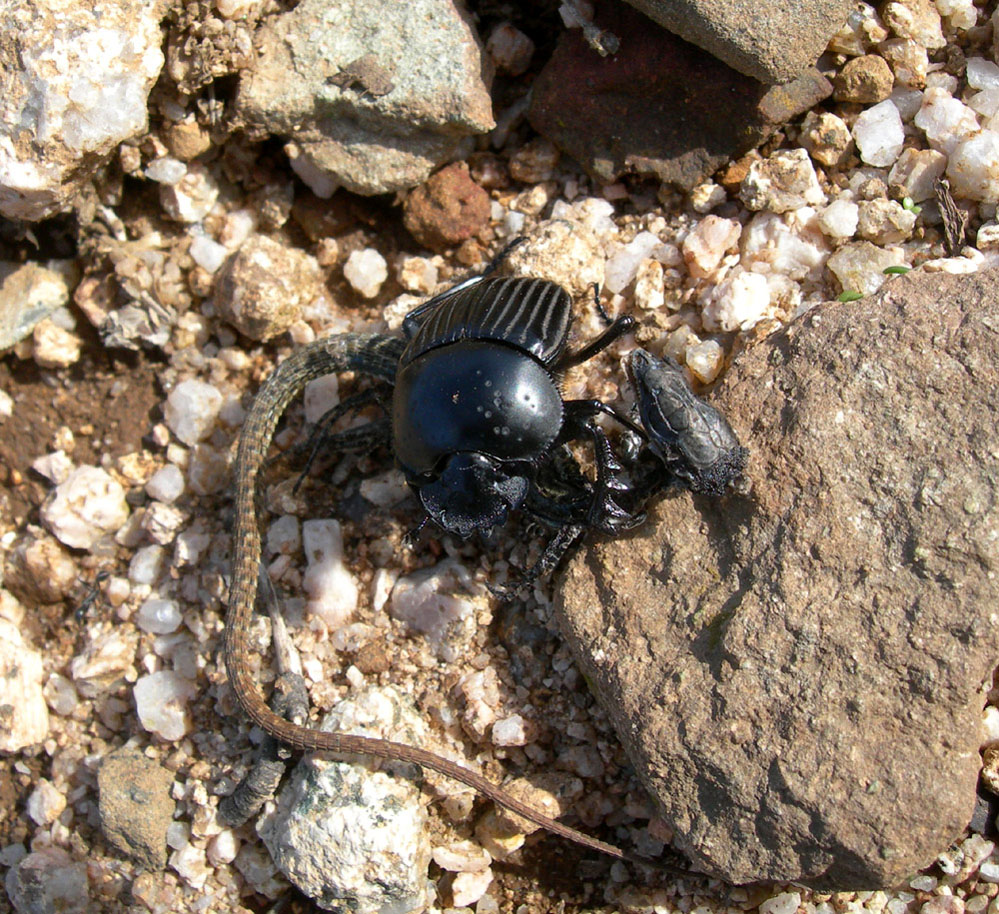 Questo Ateuchetus laticollis (Linnaeus, 1767) voleva a tutti i costi appallottolare il cadavere della lucertola (Podarcis tiliguerta) per portarsela via.