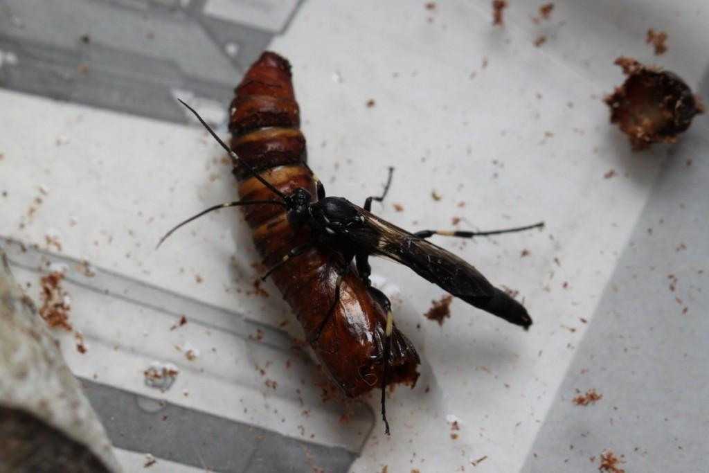 2) la crisalide fino a pochi giorni prima appariva normale perché le larve dei parassitoidi hanno bisogno di cibo fresco, e quindi vivo, non in decomposizione; perciò finché non sono giunte al termine dello sviluppo evitano accuratamente di attaccare gli organi vitali dell'ospite, il che ne provocherebbe la morte