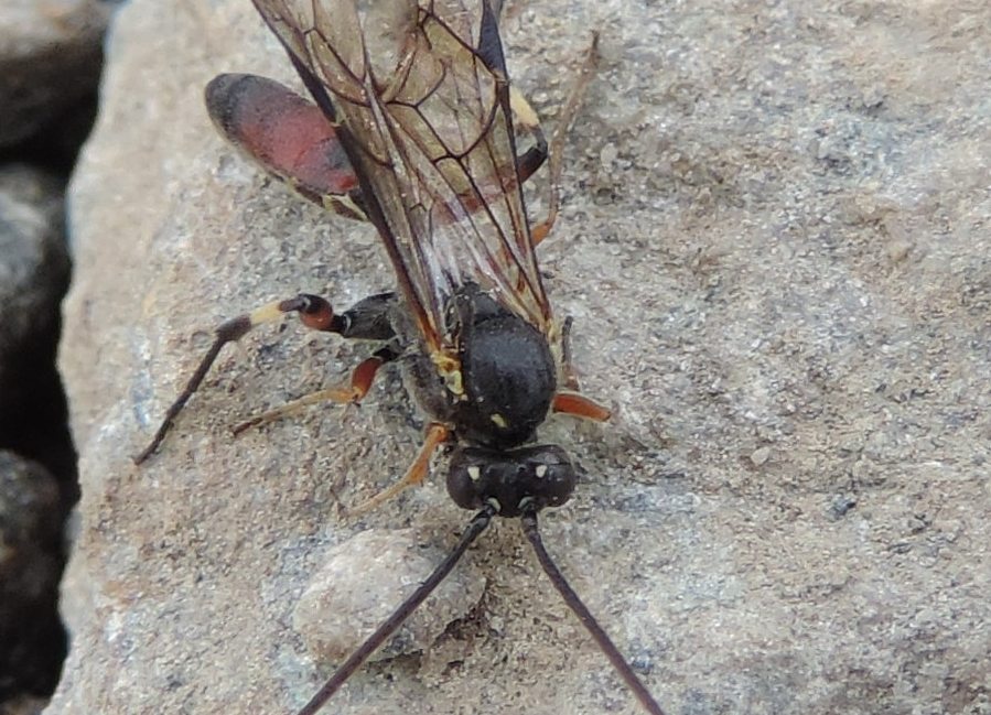 E' difficile dire di cosa si tratta con sicurezza. Tuttavia, anche io, per la forma generale del corpo, direi che è una Campoplegina. Come hai giustamente notato, in questa sottofamiglia la faccia è quasi sempre nera, nelle specie europee. Con un paio di eccezioni. Potrebbe trattarsi di Alcima orbitale. In questo caso, i punti chiari sopra gli occhi sarebbero la prosecuzione di una linea gialla sul margine interno dell'occhio. Peccato non avere una foto di faccia, che permetterebbe di vedere questa particolarità che rende questa specie inconfondibile tra le Campopleginae europee. Tuttavia, anche se non posso averne la certezza, mi orienterei su di lei. Filippo