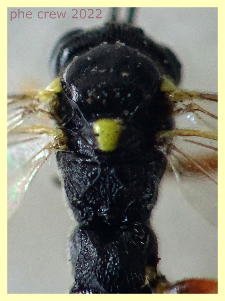 L'estensione della colorazione sulle orbite e soprattutto sul II/III tergite è variabile, anche tra i sessi. La cosa migliore è provare a vedere se l'esemplare torna con la descrizione, che, se vuoi, posso inviarti. Filippo