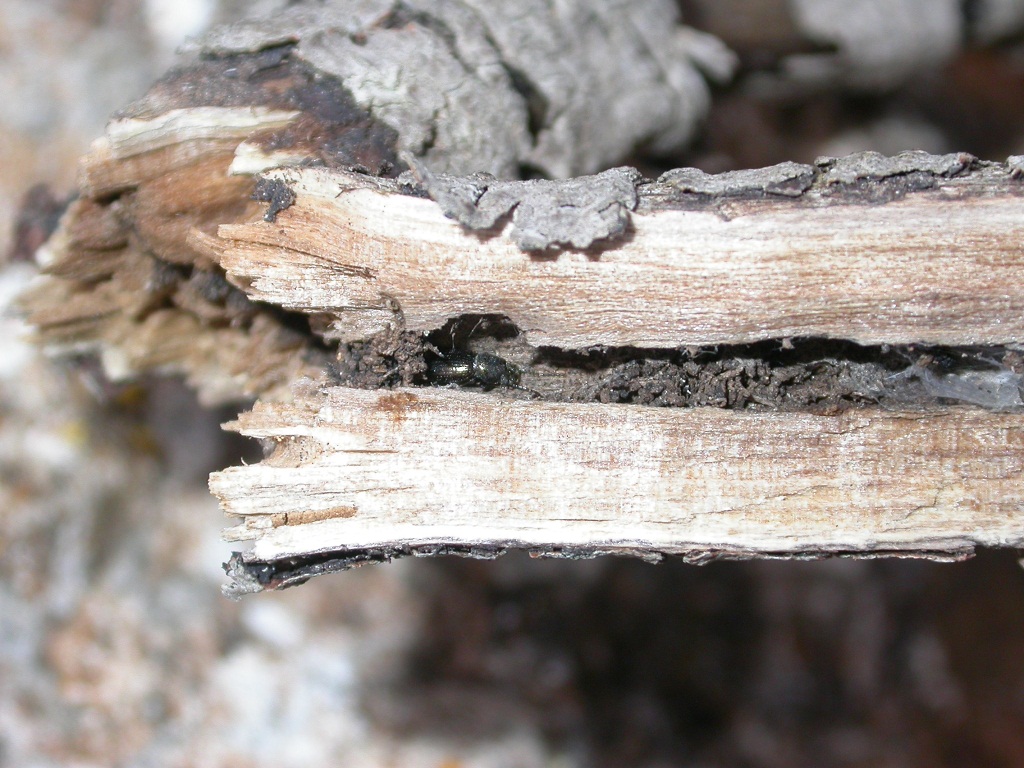 Oggi, con un po' di buona volontà e impegno, ne ho rimediato qualche altro esemplare: gradisce rifugiarsi nei fori degli xilofagi: