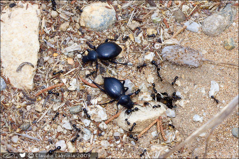 Lungo la strada più precisamente verso il centro vi erano disseminati a distanza di un po' di metri tantissimi formicai con l'entrata tappezzata di semi e vegetali di varia natura e questi coleotteri si trovavano in numero anche cospicuo praticamente a pochi centimetri dagli ingressi, incuranti delle formiche.