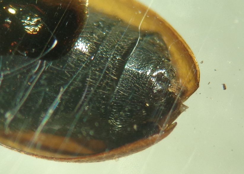 Ho dispar maschi e femmine anche presi in copula (il maschio è inconfondibile!) e pubblicati qui viewtopic.php?f=178&t=62710&hilit=Omophlus+dispar; posto foto di quella femmina, del torace e dell'ultimo sternite che sono molto differenti, in particolare il primo, da quelli del nostro sconosciuto del quale metto un paio di foto da due angolazione dello sternite ultimo che mostra come il "becco" sia preceduto solo da un molto vago accenno di fossetta che invece è netta in dispar femmina. dispar femmina inoltre è più corta, con elitre allargate dietro, per non parlare del torace, con larga doccia, fossette profonde laterali e punti sì fini ma uniformemmente distribuiti: nel nostro, ci sono due aree ovali, mediane e verso i lati (vedi foto), in cui manca la punteggiatura, lucidissime; inoltre, aggiungo che nel nostro le zampe sono uniformemente brune e non nerastre o nere. Non so se questo aggiunge qualcosa ma ormai si è detto tutto credo e rimarrà Omophlus sp. :cry: