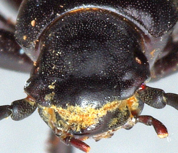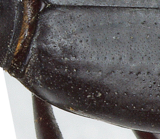 Allora: 1. il bordo anteriore del clipeo è simmetrico, 2. i punti delle strie elitrali divengono meno visibili nel terzo apicale, nell'ultimo quarto apicale scompaiono del tutto. 3. L'angolo omerale è l'angolo basale delle elitre? Se è così, allego un ingrandimento, altrimenti faccio un'altra foto.