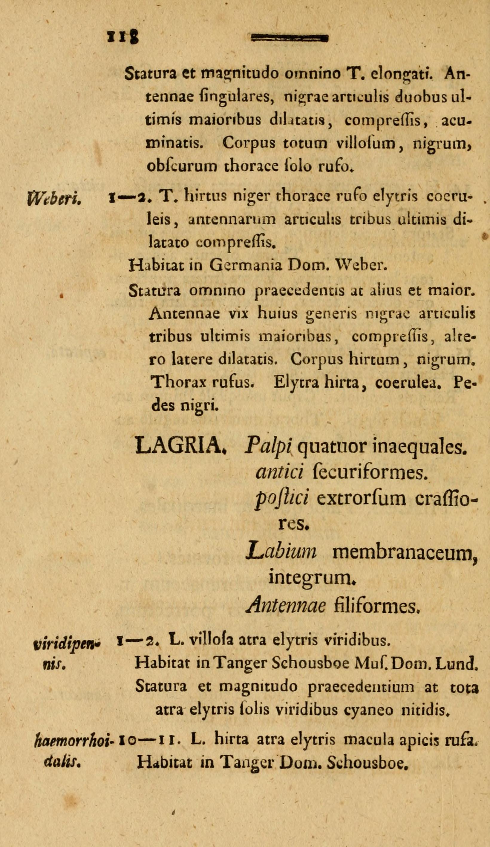 La specie descritta prima della Lagria viridipennis è Tillus weberi, e viene indicata come di dimensioni maggiori rispetto alla precedente (omnino praecedentis at alius et maior).