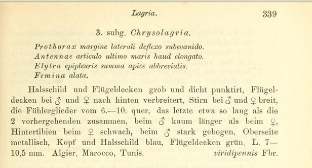 Ritorno su questo argomento per confermare che non ho trovato altri dati che possano darmi delle certezze incontrovertibili sulla determinazione di questa specie. Contemporaneamente, l'unica specie di Lagriini (tra quelle descritte) alla quale si possa attribuire l'esemplare di questo post (e l'esemplare tunisino del post di Maurizio Julodis) rimane Chrysolagria viridipennis; questo nonostante la descrizione di Fabricius non le calzi del tutto a pennello. Quello che proprio non riesco a trovare è una descrizione relativamente recente di questa specie. Un'altra cosa che sarebbe utile è la descrizione del genere Chrysolagria (di cui Lagria viridipennis è la specie tipo); sta a pagina 339 di questo lavoro: