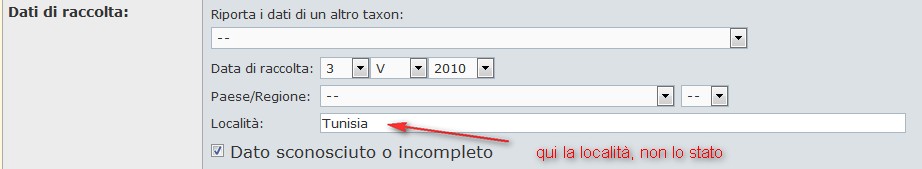 Poi, nello spazio località puoi inserire dove esattamente è stato preso, o almeno la zona (la Tunisia, per quanto non sia grande come la Cina, ha pur sempre un ambiente molto diverso spostandosi dalla costa Nord al Sud desertico). Se hai solo il dato dello stato, puoi sempre inserire in località un punto o un trattino, per non dover segnare i dati come incompleti.