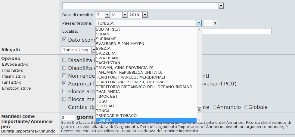 Tu inserisci il dato dello stato nel campo località, ma così facendo non viene rilevato dal sistema di ricerca con filtro geografico, per cui se qualcuno cerca gli insetti presi in Tunisia, i tuoi esemplari non compaiono (te l'ho già scritto altre tre volte, ma non mi hai risposto)