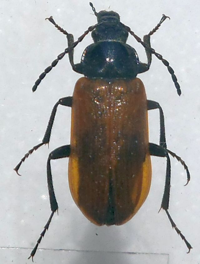 Vediamo se si riesce a chiudere questa faccenda. Più guardo la foto, più mi convinco di vedere una femmina di O. dispar. D'altra parte è noto che la fotografia ha solo rapporti occasionali, sporadici e casuali con la realtà. Lo dico, mestamente, da fotografo. Prova a controllare queste opposizioni di caratteri, e sappimi dire che opinione ti fai: O. lepturoides, femmine. Statura maggiore (fino a 14 mm); pronoto e capo, se esemplari freschi, dotati di pubescenza evidente, lunghetta, bianco argentea; base del pronoto diritta, senza sinuatura davanti allo scutello; epipleure (ovviamente viste di profilo) molto larghe sotto gli omeri, poi ristrette rapidamente e molto bruscamente ridotte in larghezza fino a scomparire quasi all'altezza delle anche posteriori; inoltre concave nella parte più larga, non verticali rispetto alla sezione orizzontale del corpo, ma abbastanza inclinate, circa 45%. ; antennomeri tutti concolori, da bruno scuro a piceo, mai bicolori. Ultimo sternite visibile strettamente inciso all'apice, assolutamente privo di lobo centrale proteso all'indietro. O. dispar, femmine Statura minore (fino a 12 mm); pronoto e capo glabri, molto lucidi, punteggiatura rada e superficiale, irregolarmente spaziata; pronoto con una fovea centrale alla base, davanti allo scutello (vedo che l'hai notata nel tuo primo post), margine basale del pronoto sinuato; epipleure relativamente strette sotto gli omeri, poi molto progressivamente ristrette fino a divenire sottilissime a partire dal livello delle anche posteriori; appiattite e non concave nella parte prossimale più larga, non verticali rispetto alla sezione orizzontale del corpo, ma molto inclinate, ben più di 45%. ; antennomeri 1-4 quasi sempre bicolori, base ferruginea o bruno chiaro, apice piceo. Ultimo sternite visibile lobato al centro, il lobo mediano nettamente proteso all'indietro, profondamente foveato. Sono sicuro che deciderai il giusto nome in un quarto d'ora. Ciao, buonanotte, A. |