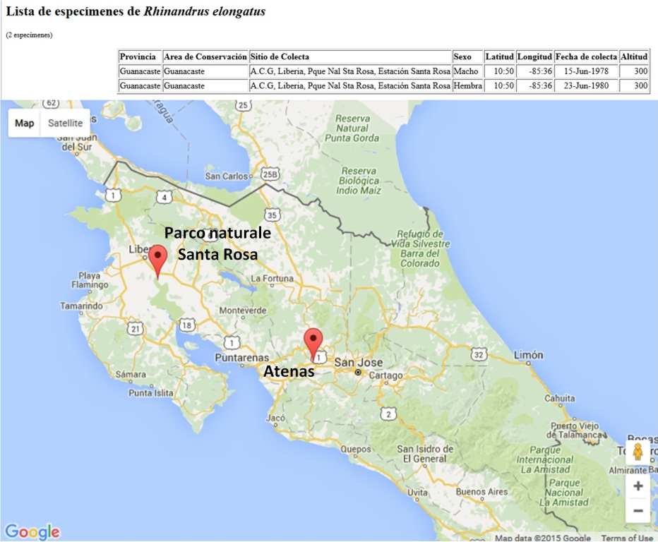 Ciao a tutti Questo Tenebrionidae proviene dal Costa Rica (credo sia molto comune) Per il genere direi Rhinandrus (Leconte, 1866) Per la specie, in base a poco materiale reperito su Internet, direi elongatus (Horn, 1866) Questa specie è presente in Costa Rica ed è stata censita nell'area del Guanacaste; io l'ho trovato più a Sud (Atenas - vedi mappa) in un ambiente abbastanza simile (abbastanza secco) Ho aggiunto alcune foto di Rhinandrus elongatus (Horn, 1866) prese da http://140.247.119.225/mcz/recordlist.phpGrazie dell'aiuto e buona giornata Paolo Lunghezza = 25mm Trovato spostando un tronco