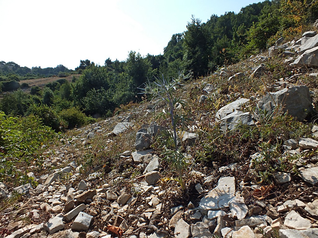 Qui l'ambiente è ancora più xerico. Il suolo è quasi soltanto calcare fissurato, con un po' di terra tra una roccia e l'altra. In primavera ed autunno, tra le rocce è tutto verde, e si trovano Chrysolina, Curculionidae, Meloe, Tenebrionidae, Scarabaeidae, ecc., ma ora è tutto secco. Uniche cose vive visibili, delle piantine stentate di Eryngium sparse qua e là.