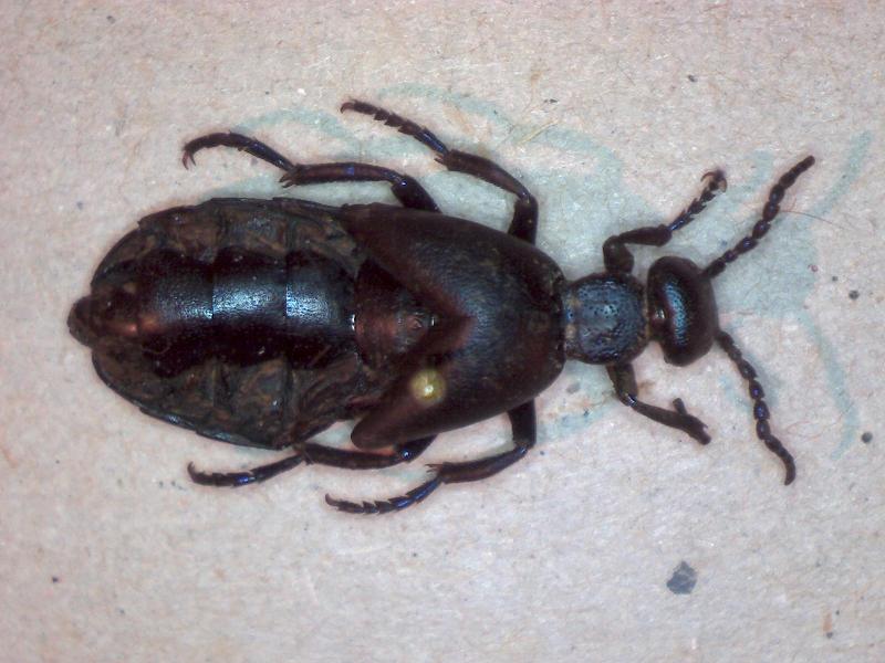 Questa femmina di Meloe l' ho trovata (anzi, l' ha trovata mio padre :D ) mentre si muoveva goffamente fra i fili d'erba affioranti in una pozzanghera. Può trattarsi del Meloe violaceus?