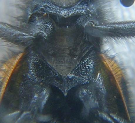 Intanto c'è da dire che bisognerebbe osservare il carattere a maggiore ingrandimento e poi forse schermando un po' di più la luce. Forse tu ti sei basato solo sul fatto che non sembra avere apparentemente una pubescenza però secondo me lo scutum è punteggiato. Ti allego una foto ritoccata che è venuta una mezza ciofeca che indica in giallo dove si trova lo scutum del mesosterno.