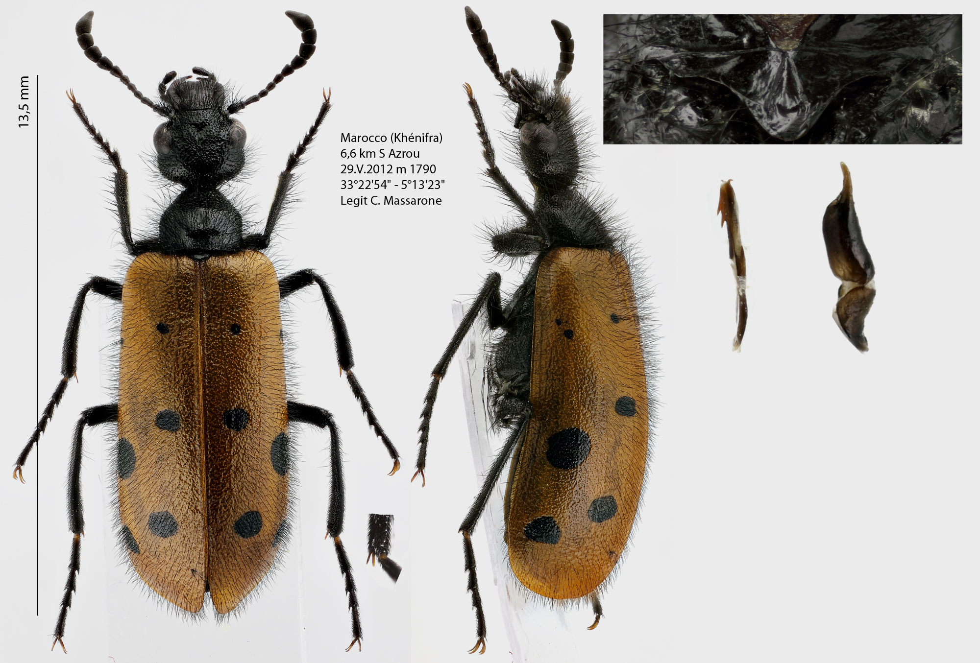 Da un po' di tempo avevo l'intenzione di iniziare a studiare questa interessante famiglia e così mi sto preparando delle schede sulle diverse specie che identifico. E allora perché non metterle nel forum? Ho iniziato grazie alla gentilezza di Carlo che mi ha gentilmente inviato i meloidi freschi freschi del suo viaggio Marocco nel 2012 ma soprattutto alla disponibilità di Marco Bologna che mi aiuta continuamente a risolvere i miei dubbi iniziali (che sono tanti, ahimé ).Il sottogenere Mesosulcata Pardo Alcaide, 1950 si individua facilmente per la presenza sul mesosterno di due solchi longitudinali divergenti posteriormente. Attualmente comprende le seguenti specie con le relative distribuzioni: hieracii Graells, 1849 E: FR PT SP hirtipennis Raffray, 1873 N: AG MO thamii Kocher, 1963 N: MO |