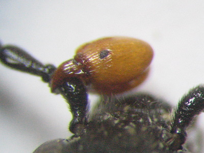 Ciao. Ribadisco che la "cosa" attaccata all'antenna anche a mio avviso è una testa di formica, forse attribuibile al genere Pheidole. Se guardi una testa di formica di lato, le mandibole hanno esattamente quella forma e la chiazza pigmentata a due terzi della sezione più lontana dall'antenna è l'occhio sinistro della formica. Strano ma vero...
