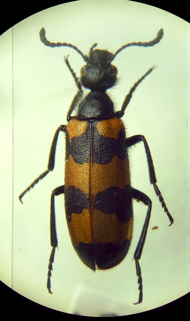 Raffaele la spina esterna delle metatibie delle Croscherichia è molto più grossa dell'interna, decisamente differenti. Le spine della tua sono un po' appiattite ma più o meno eguali tra loro come lo sono nel genere Mylabris. A me sembra una Mylabris tricincta, dovresti controllare se al centro del margine superiore del mesosterno ha uno scutum ben evidente con una zona ventrale pubescente (sottogenere Mylabris). La devi guardare un po' di profilo per vedere se ha un ciuffetto di setole in mezzo allo scutum.