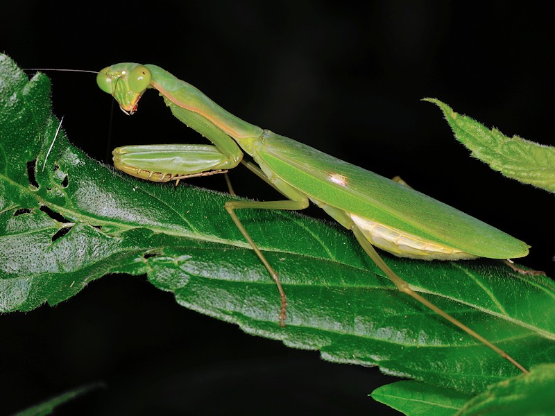 A bulbul or merl seemed to be poking its beak at something among the flowers and leaves at the end of a branch of a mango tree. It fluttered from one position to another, seeming to peer among the leaves from time to time. Then something green, apparently an insect, hopped onto the upper surface of a leaf. Even as I was wondering if it was a leaf insect, a bush cricket or a mantis, the bulbul darted at it, then immediately recoiled. The green insect was a mantis and it had struck out at the bird with its front legs! Even as I realised this, it let go of the leaf and drifted to the ground. The bulbul followed and fluttered above where it had landed. I ran over and got there first. It was a large female specimen of the new mantis.