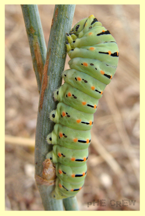 ...e questo e' il bruco della Papilio Machaon su un gambo di finocchio selvatico di cui sono molto ghiotte e ne vengono attratte dall' odore.