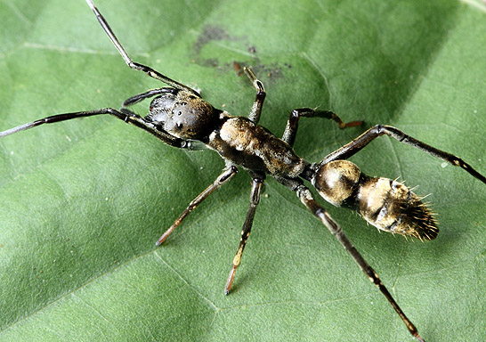 Il mirmecomorfismo come mimetismo batesiano è EVIDENTISSIMO ed INEQUIVOCABILE in alcuni casi, quindi non ci sono dubbi. Guarda per esempio Sphecotypus niger, un ragno neotropicale, che indiscutibilmente mima alcune Neoponera spp. (per esempio la comunissima Neoponera villosa) e lo fa sicuramente per mimetismo batesiano perché le Neoponera hanno una puntura atroce. Notare soprattutto lo pseudo-ocello monolaterale sul cefalotorace che mima un occhio della formica e il restringimento dell'opistosoma identico a quello del gastro delle Ponerinae. Davvero non facile cogliere subito la differenza. Semplicemente sì: i predatori a cui è rivolto il mimetismo batesiano mirmecomorfo (ma in generale tutte le forme di mimetismo batesiano tra gli artropodi, e non credo che vogliamo metterlo in discussione in tutto il Phylum) non sono principalmente (cioè nella maggior parte dei casi) altri artropodi, ma vertebrati (uccelli, rettili, piccoli mammiferi). Ma questo cosa cambierebbe? Cita: Ho raccolto su FNM una galleria fotografica di ospiti, simbionti, spazzini o parassiti, fotografati dentro formicai, e nessuno di loro somiglia visivamente ad una formica. Questo perché, come già detto, mirmecofilia e mirmecomorfismo non sono per niente correlati, ma indipendenti. E anzi, la concomitanza delle due cose è estremamente rara, dato che un animale mirmecofilo, vivendo per la maggior parte del tempo nei nidi delle formiche, di solito non ha una grossa necessità di mimetismo, mentre è proprio tra gli animali non mirmecofili che esiste eventualmente un vantaggio maggiore nel mimare qualcos'altro. E anche qui non vedo il punto...