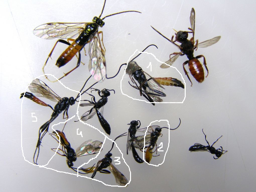 Poi ci sono 3 sfecidi, nerastri con le ali che non arrivano alla fine dell'addome, con venatura alare un pò strana, tipo Trypoxylon (se ne occupa Maurizio Mei e se li porti a Modena sicuro ti dice che sono)