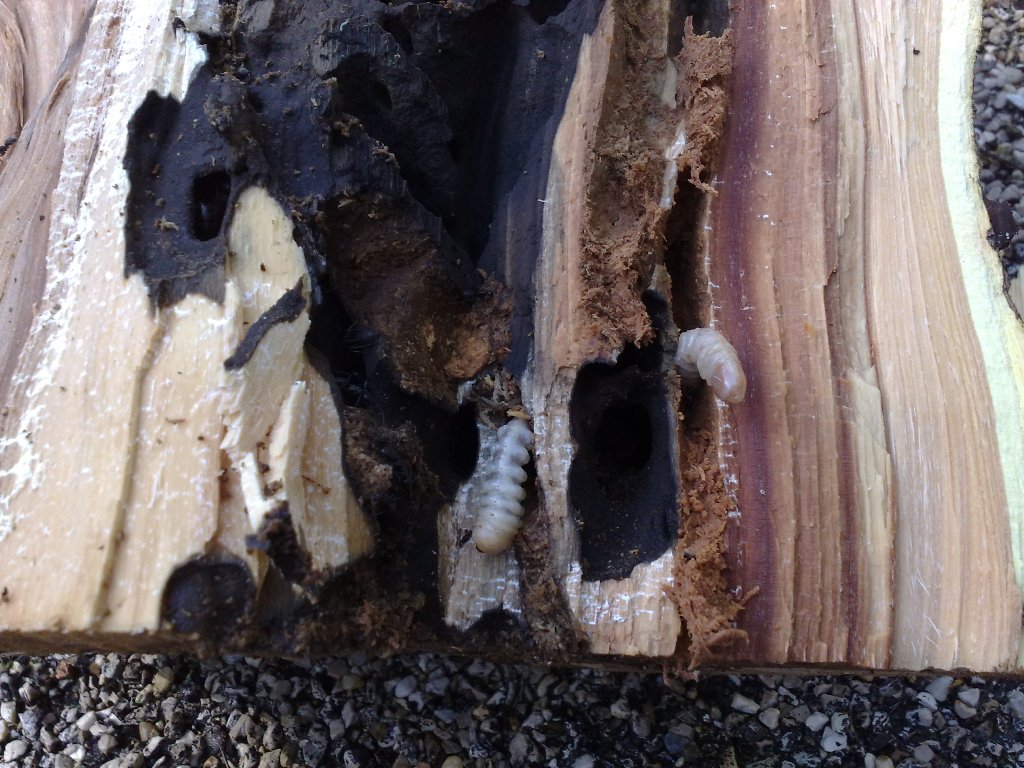 Il problema delle formiche si risolve facilmente. Stacca una parte del ciocco (si chiama così anche da me, e penso un po' ovunque) libera da formiche e rimettici le larve. Se non c'è rimasta una galleria aperta sufficiente, togli un po' di segatura da una galleria preesistente tanto da poterci far rientrare la larva o scavagli una galleria con un trapano, un po' più grande della sezione della larva, ma non troppo, poi mettila dentro e reggila finchè non entra per almeno 2/3 del corpo, ed al resto ci pensa da sola. Se vuoi essere sicuro che non venga raggiunta dalle formiche (nel caso ce ne fossero ancora, che magari escono da qualche buco nel legno), quando ha scavato un po' e si è allontanata dal foro, tappalo con un po' di cotone o carta igienica, e se vuoi proprio strafare dopo ci puoi colare un po' di cera sopra per tappare meglio il foro.