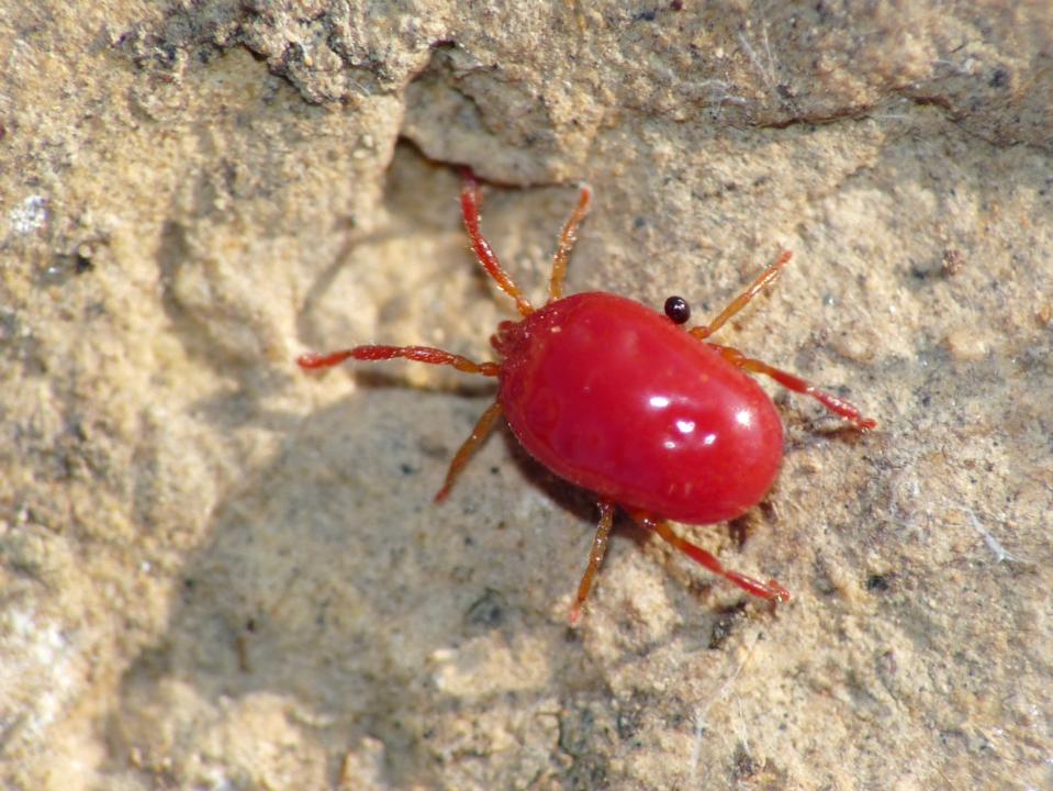 L'acaro da te ritratto potrebbe essere un eritreide, più che uno smaridide (non so dire se parassitato, potrebbe esserlo). Sono entrambe (e le sole) famiglie di Erythraeoidea. Negli Smarididae l'intero gnatosoma è retraibile all'interno dell'idiosoma, mentre negli Erythraeidae solo i cheliceri sono retraibili. Questa è la teoria, quanto alla pratica solo uno specialista del gruppo potrebbe riconoscerli solo dall'habitus.