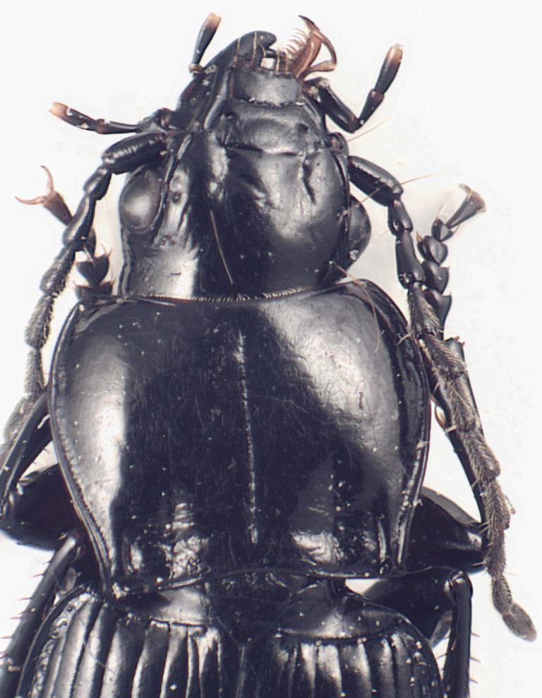 Angoli posteriori protorace spigolosi, no setole su 7a interstria, depressioni alla base del pronoto non puntinate, fossetta basale esterna del pronoto ben distinta, dimensioni 11,5mm, angoli posteriori del protorace retti e spigolosi, no riflessi metallici sulle elitre, no punteggiatura pronoto e fossette, protorace sinuato ai lati ..... l'impressione basale interna del pronoto mi sembra più prolungata in avanti dell'esterna anche se le zampe ....NERISSIME .... no pori setigeri su quinta interstria. Credo di aver messo tutto :D
