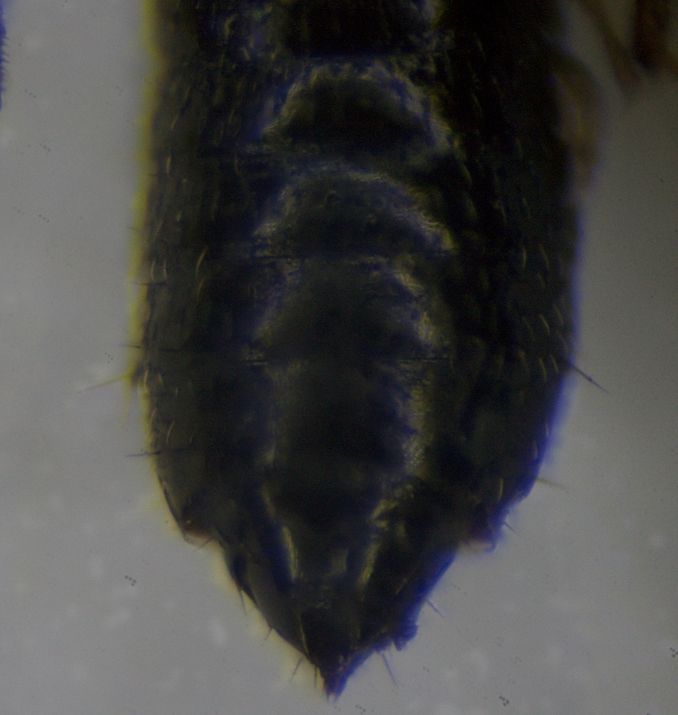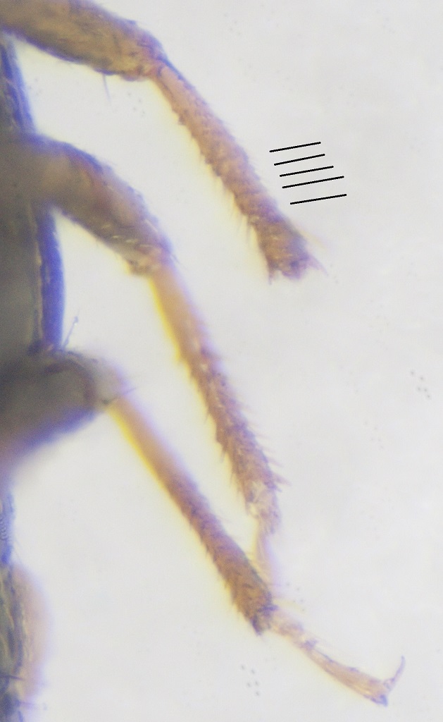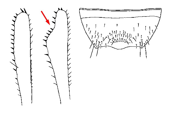 Is there a notch on the outer margin of protibia at apex? Also, because this is a male, there are specific characters on the ventrites 7 and 8...