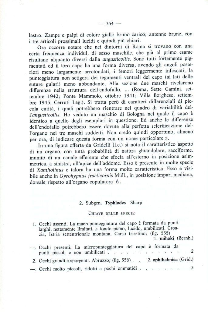 Provo a fare il punto della situazione. Ho preso il volume della Fauna d'Italia e ho seguito le chiavi. Osservando l'esemplare al massimo ingrandimento ho constatato la presenza di occhi ridottissimi, formati solo da pochi ommatidi. Concordo con Giuseppe che siamo nel sottogenere Typhlodes. Concordo anche sul fatto che le due specie più probabili, stando al volume che è uscito nel 1982, sono holdausi e italica. Però, secondo me, nessuna delle due descrizioni corrisponde del tutto all'esemplare in questione. Se questo è vero, faccio due ipotesi: gabrielei, come suggerisce Anillus (ma non ho la relativa pubblicazione), o una specie ancora non conosciuta. Tutto ciò, visto che come detto non ho pratica di stafilinidi, senza aver estratto l'esemplare (del quale non conosco il sesso, perchè non sono sicuro che nel sottogenere Typhlodes i maschi abbiano i tarsi allargati). Sottolineo anch'io che non ho trovato, nel testo, alcun accenno alla mirmecofilia, che sembrerebbe essere un elemento di novità. Concludo ribadendo quanto detto nell'intervento precedente: se uno specialista del gruppo ritiene di studiare l'esemplare, me lo faccia sapere.